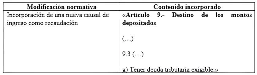 En ese contexto, el Decreto Legislativo N.° 1713 incorpora como nueva causal de ingreso como recaudación el hecho de que el titular de la cuenta de detracciones mantenga deuda tributaria exigible. Esta modificación busca reforzar la finalidad del Sistema de Detracciones, asegurando que los fondos depositados en dichas cuentas sean destinados prioritariamente al cumplimiento de las obligaciones tributarias a cargo de sus titulares.