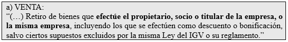 La Ley del IGV no establece una definición de retiro de bienes, pues como se ha indicado, se limita a precisar que “también se considerará como venta”. Sin embargo, el inciso c) del numeral 3 del artículo 2 del Reglamento de la Ley del IGV establece una serie de supuestos considerados como retiro de bienes, entre los que se encuentran las transferencias a título gratuito, y la entrega de bienes a los trabajadores que no califiquen como condición de trabajo, entre otros.