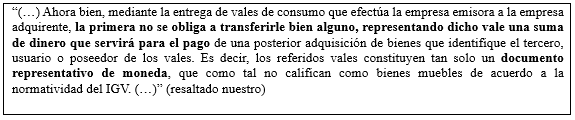 En el caso de los vales de consumo o gift cards, como es conocido es un mecanismo por el cual la empresa que los emite, los entrega a otra parte adquirente, para que luego éste los entregue a un tercero, que finalmente los usará para adquirir bienes no específicos y dentro de un plazo. Por lo que la entrega de la empresa de los vales al trabajador, no se trataría de una operación gravada con el IGV, al no calificar estos como bienes muebles.