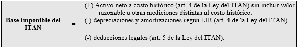Conforme al artículo 4 de la Ley del ITAN, la base imponible del impuesto está constituida por el valor de los activos netos consignados en el balance general, deducidas