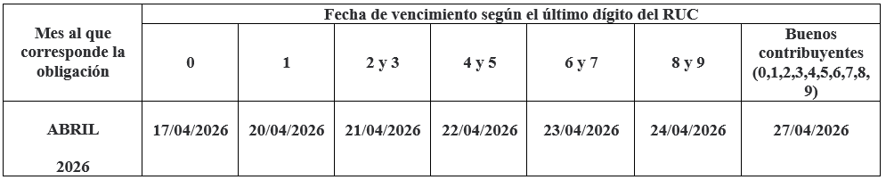 La declaración y el pago del ITAN se efectúan conforme al cronograma de obligaciones mensuales aprobado por la Sunat, en función del último dígito del RUC. En ese sentido, para la presente campaña, los vencimientos correspondientes al periodo abril de 2026 se detallan a continuación: