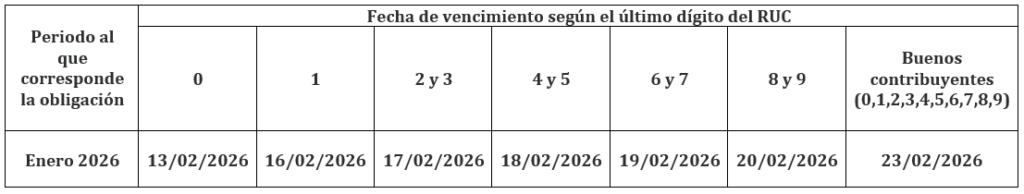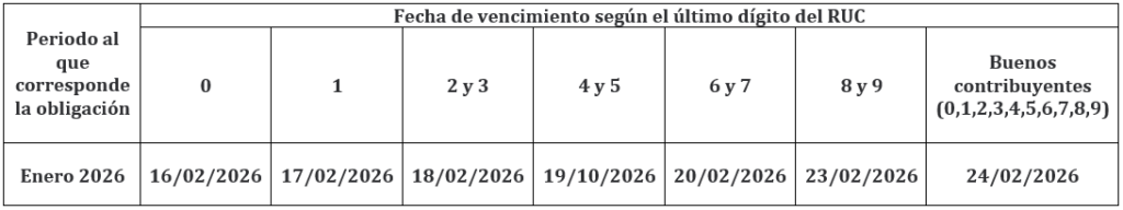 Por otro lado, las fechas de vencimiento de las obligaciones mensuales (como, por ejemplo, pagos a cuenta del impuesto a la Renta, IGV, entre otras), correspondientes al mes de enero 2026 son los siguientes: